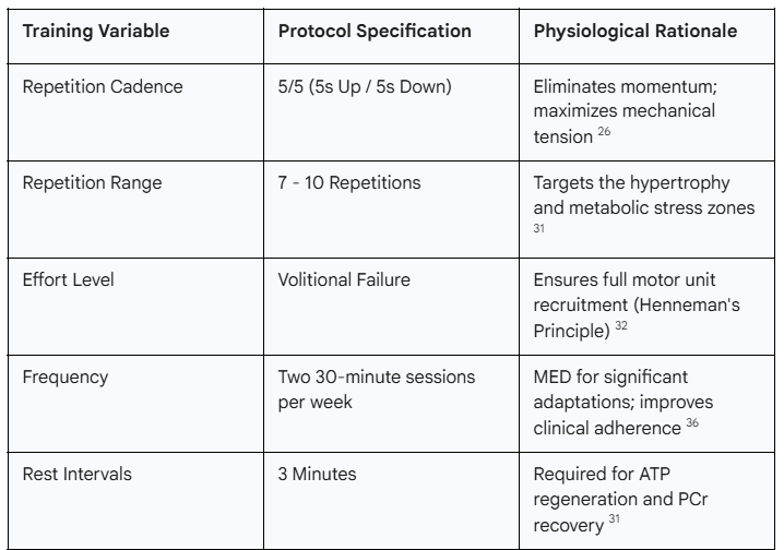 The protocol centers on a "Super Slow" cadence, typically utilizing a 5-second concentric phase followed by a 5-second eccentric phase (5/5). The primary physiological rationale for this tempo is the elimination of momentum. In traditional resistance training, the use of explosive concentric movements allows for a "launching" of the weight, where the initial acceleration carries the load through the sticking point, reducing the mechanical tension on the muscle for a significant portion of the range of motion.26 By slowing the movement, the muscle is forced to maintain constant mechanical tension throughout the entire lift, maximizing the metabolic stress on the fibers.26