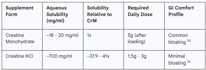 Creatine is one of the most effective and safe ergogenic aids for enhancing strength and preserving LBM.56 While Creatine Monohydrate (CrM) is the most widely researched form, Creatine Hydrochloride (Cr-HCl) is often preferred for patients on GLP-1 therapy due to its superior solubility and GI profile.57