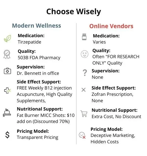 At Modern Wellness, we recognize that the safety of your medication is as critical as its efficacy. We exclusively administer Tirzepatide sourced from FDA-registered 503B Outsourcing Facilities. This distinction is vital: unlike the "research use only" or "not for human consumption" peptides frequently found at online vendors or local nutrition stores in Albuquerque, our medication is manufactured under federal Current Good Manufacturing Practices (cGMP). These are the same rigorous standards required of major pharmaceutical manufacturers. Every batch we use is chemically validated to be sterile, potent, and free of toxic residuals. We do not expose our patients to the unregulated "gray market" of research chemicals, which often contain industrial solvents, unknown impurities, and bacterial endotoxins.